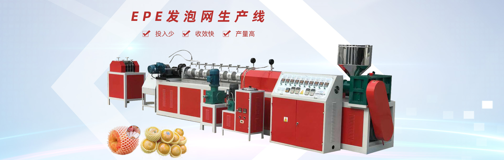 龍口市山河塑業(yè)有限公司生產(chǎn)的發(fā)泡網(wǎng)套機(jī),用于水果、蔬菜、花蕾及瓶類的外包裝。我公司具有多年的實踐經(jīng)驗和可靠的技術(shù)力量,根據(jù)市場需求開發(fā)各種規(guī)格的網(wǎng)套。每24小時生產(chǎn)蘋果網(wǎng)套80萬-120萬個,設(shè)備驅(qū)動電機(jī)采用變頻控制,調(diào)速精度高、范圍廣、能耗低、運行可靠每小時僅用電10度左右,產(chǎn)量提高。此外,該生產(chǎn)線配置不同的模頭和輔機(jī)可生產(chǎn)發(fā)泡片、發(fā)泡管、發(fā)泡棒、發(fā)泡條及異型材等產(chǎn)品。